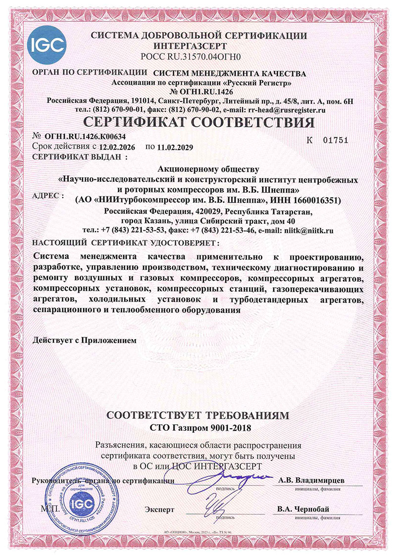 Успешно завершился ресертификационный аудит системы менеджмента качества организации на соответствие требованиям СТО Газпром 9001-2018. Внешним аудитором выступала ассоциация по сертификации «Русский регистр». В ходе аудита была проанализирована деятельность АО «НИИТК» по разработке и производству компрессорного оборудования. Комиссия подтвердила высокое качество продукции и документации СМК, а так же отметила потенциал организации к дальнейшему развитию. По результатам прошедшего аудита, было принято решение о выдаче сертификата соответствия.